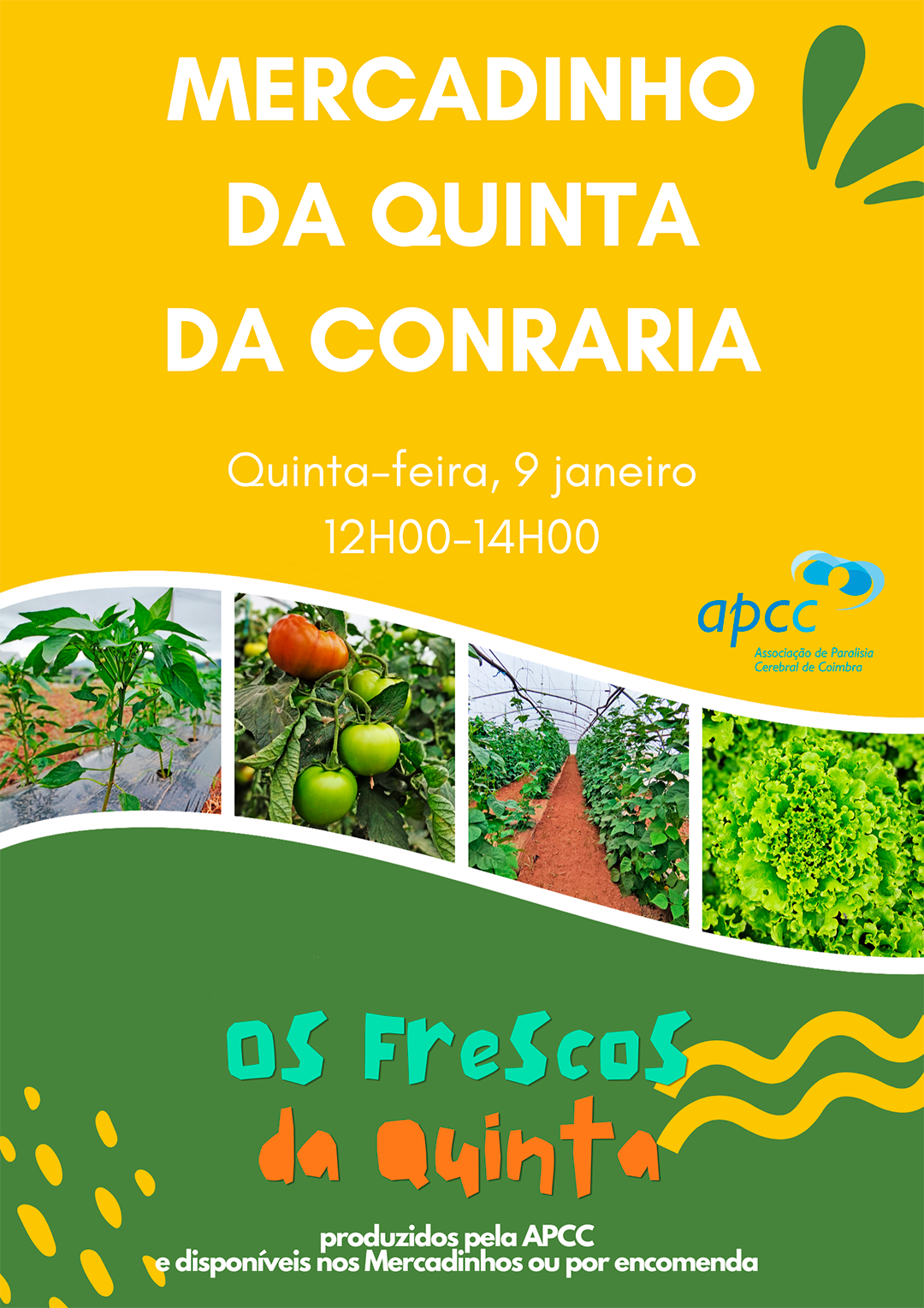 Tem também à sua disposição a possibilidade de encomendar Os Frescos da Quinta, até 8 de janeiro. Veja na página de Facebook da APCC os produtos disponíveis para a semana em causa e faça a sua encomenda através do telefone +351 239 802 820, do e-mail armazem.quinta@apc-coimbra.pt ou do formulário disponível em https://bit.ly/osfrescosdaquinta. Poderá depois levantá-la durante o Mercadinho do Centro de Reabilitação, que se realiza no dia 10 de janeiro (11H30-13H00).